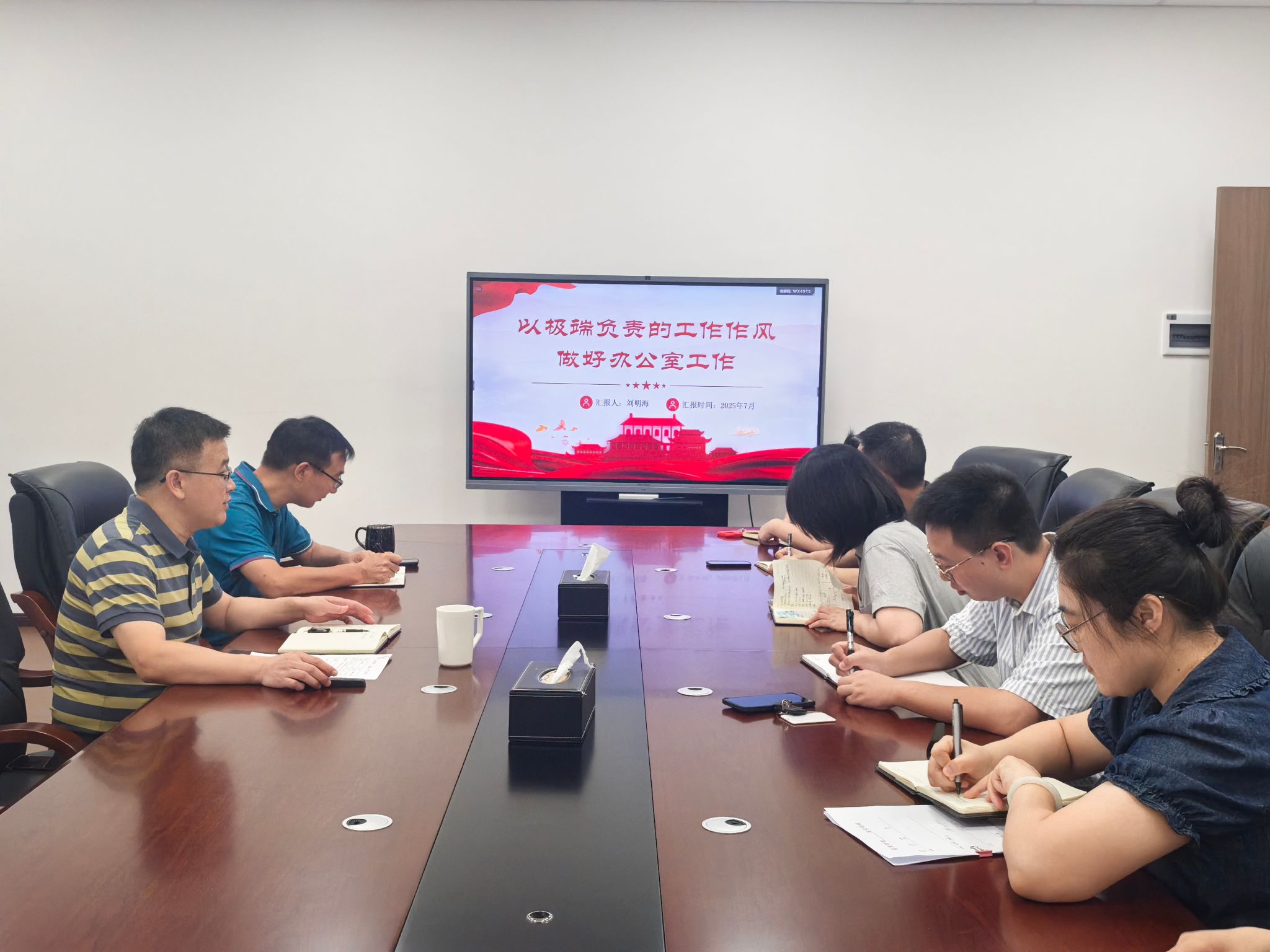 刘明海从党政办工作职责入手,结合中央八项规定精神的核心要义,以《以极端负责的工作作风做好办公室工作》为题,从涵养“恪尽职守、认真负责”的思想自觉,厚植极端负责的“动力源”、弘扬“马上就办、真抓实干”的优良传统,提振极端负责的“精气神”、践行“严谨细致、精益求精”的工作理念,绘好极端负责的“工笔画”、遵循“按规律办事、按规矩做事”的基本原则,标注极端负责的“经纬线”、加强“勇于担当、善于作为”的能力建设,夯实极端负责的“硬支撑”5个方面对办公室职能作用、工作作风提出了详细要求。他要求全体党员要准确把握中央八项规定精神的核心要义,自觉把思想和行动统一到党中央决策部署上来,扎实开展好学习教育,不断锤炼党性、提高觉悟,养成严守纪律规矩的好习惯、好作风;要充分发挥党政办的职能作用,严格落实“精文简会”要求,确保行政接待务实高效,要严格落实“五个坚持”工作要求,不断强化标杆意识、带头意识和担当意识,自觉挑大梁、当表率、作贡献。